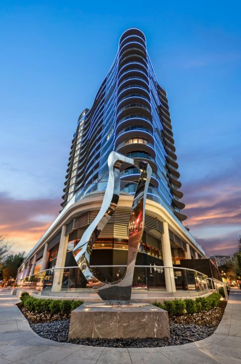 The piece is a 16 foot tall, stainless steel, mirror finish sculpture titled “Uptown Moment” which was inspired by the building’s elegant curved slab which carries up through the tower. At first viewing of One Uptown local artist Brad Oldham narrowed in on the distinctive shape of the building. The location, the visual experience and the ideas inspiring the artist all pulled together in the title “Uptown Moment”. Per the artist “consider the moments in your life that are “frame worthy” or the memories that are triggered in viewing your personal framed artwork”…Uptown Moment intends to capture those moments. To this point Brad has skillfully played with the iconic shape of the building’s slab to produce a sculpture that viewers and pedestrians will want to engage with. The sculpture “Uptown Moment” sits at the main corner of McKinney and Routh the epicenter of the social scene in Uptown Dallas.